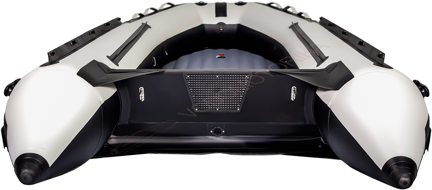 На лодке установлен стационарный транец, жестко приклеенный к баллонам.