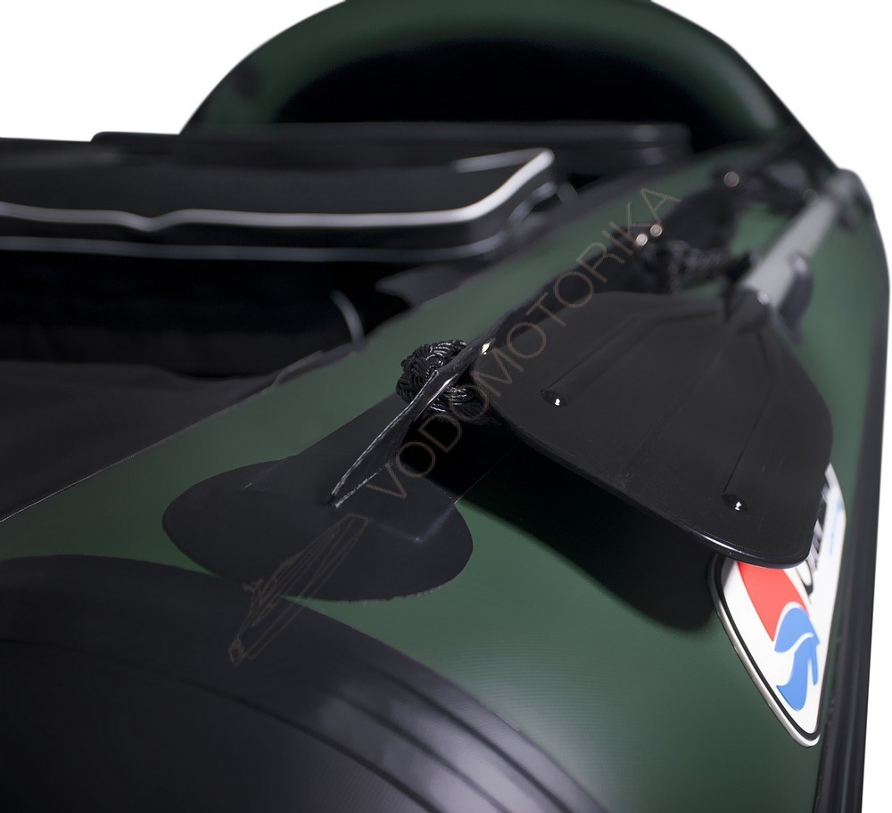 Сверхпрочная проклейка из полиуретановой ленты (броня), толщиной 5 мм по всей длине баллонов и килю, которая позволяет использовать лодку в суровых условиях.