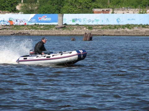 Лодка имеет транец из окрашенной водостойкой фанеры, который жестко приклеен к баллонам. В месте крепления двигателя предусмотрены накладки для уменьшения износа.