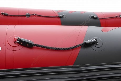 Надувная лодка поставляется с красными баллонами и серым корпусом.