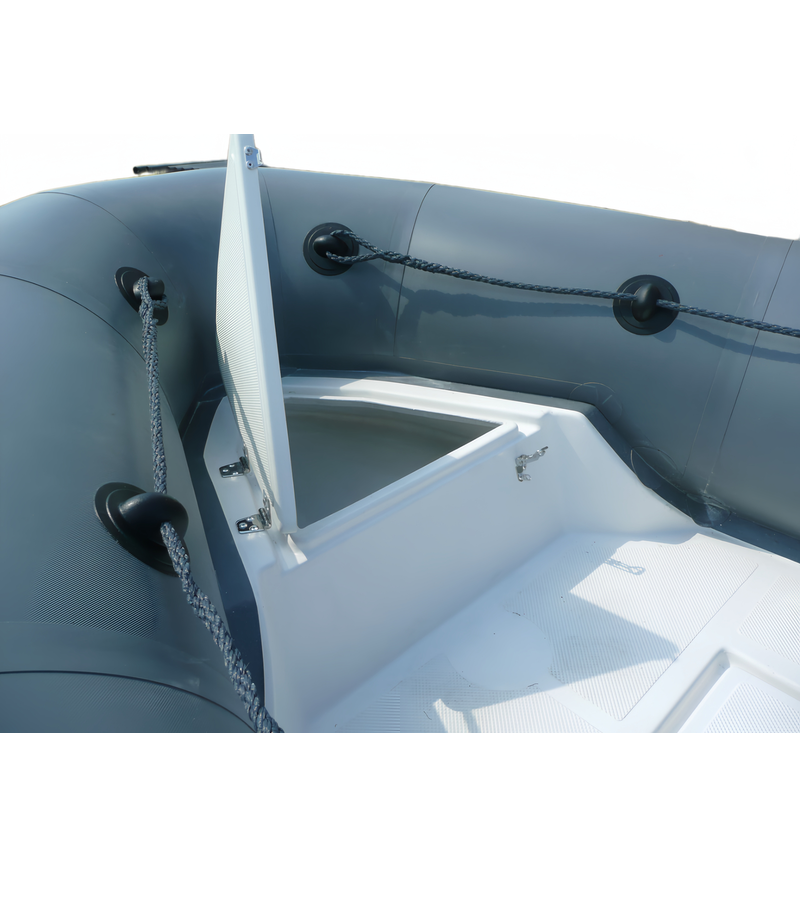 На надувной лодке установлен стационарный (жестко вклеенный) транец. В месте крепления двигателя предусмотрены накладки для уменьшения износа.