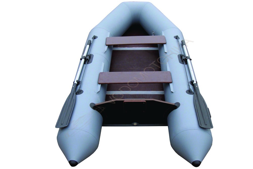 Надувная лодка имеет стационарный транец из влагостойкой фанеры.