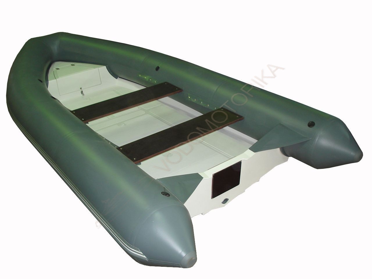 Лодка имеет жесткий пол из стеклопластика с антискользящим рельефом.