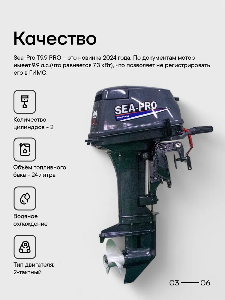 Подвесной лодочный мотор SEA-PRO Т 9.9 PRO рассчитан под стандартную высоту транца 381 мм и имеет общий вес 41 кг. Имеется режим для передвижения по мелководью. Предусмотрен выносной топливный бак объемом 24 л. Винт трехлопастной, изготовлен из алюминия. Двигатель произведен в Китае, гарантия на изделие – 2 года.