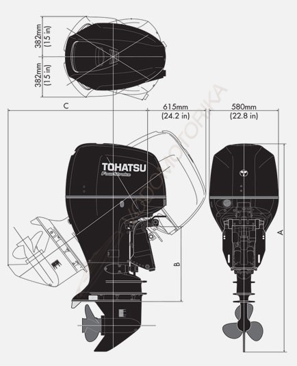 Подвесной лодочный мотор Tohatsu BFT115A LU рассчитан под высоту транца 635 мм и имеет вес 217 кг.