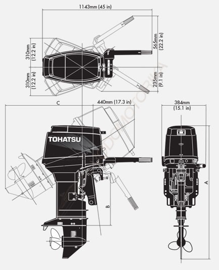 Подвесной лодочный мотор TOHATSU M50D2 EPTOL рассчитан под высоту транца 508 мм и имеет общий вес 87 кг.