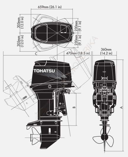 Подвесной лодочный мотор TOHATSU M70C EPTOL рассчитан под высоту транца 508 мм и имеет общий вес 115 кг.