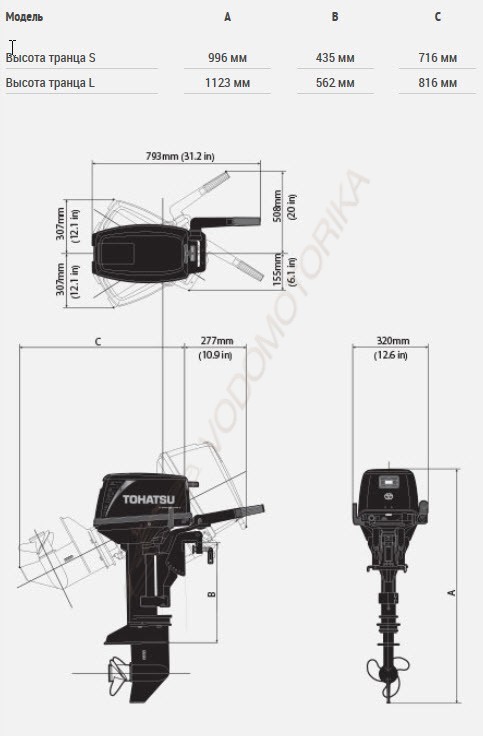 Подвесной лодочный мотор TOHATSU M9.8B L рассчитан под высоту транца 508 мм и имеет общий вес 27 кг.