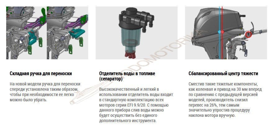 Сместив такие тяжелые компоненты, как коленвал и привод на 30 мм вперед по сравнению с предыдущей версией моделей, производитель снизил перевес на 26%, тем самым значительно упростив процедуру наклона мотора вручную.