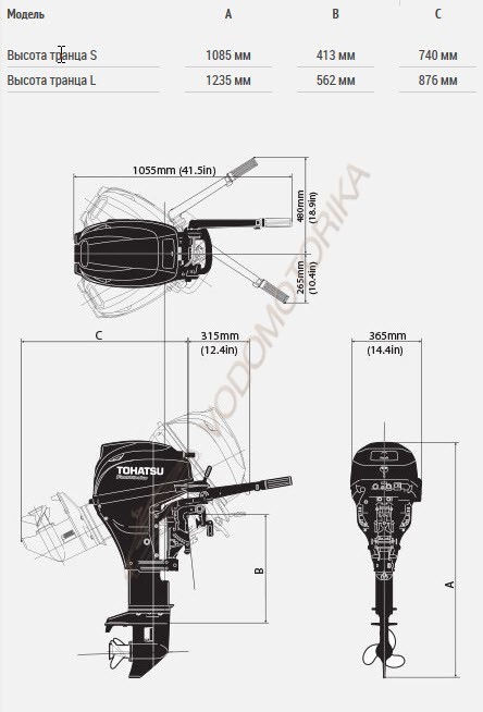 Подвесной лодочный мотор Tohatsu MFS 20 CEPL рассчитан под высоту транца 508 мм и имеет вес 47 кг.