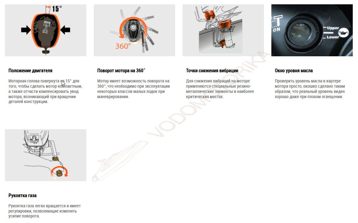 Мотор имеет возможность поворота на 360°, что необходимо при эксплуатации некоторых классов малых лодок при маневрировании.