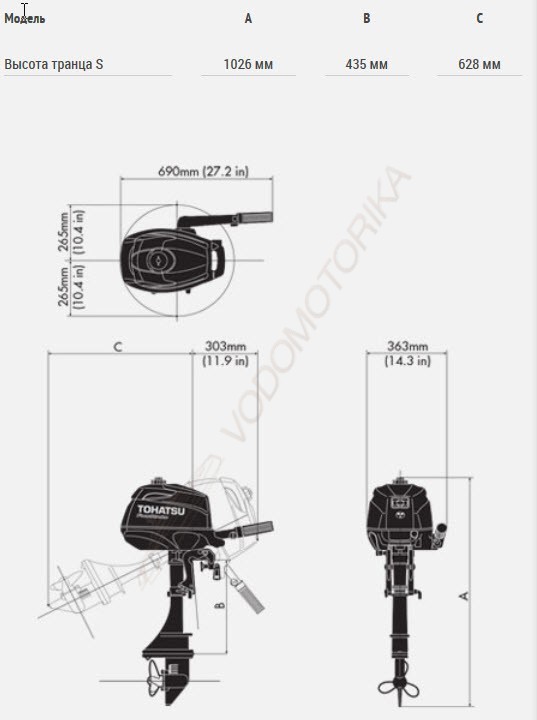 Подвесной лодочный мотор Tohatsu MFS2.5B S рассчитан под высоту транца 381 мм и имеет вес 43 кг.
