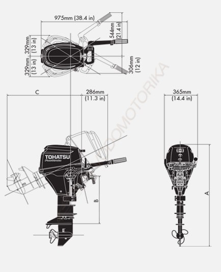Подвесной лодочный мотор Tohatsu MFS9.8A3 S рассчитан под высоту транца 381 мм и имеет вес 37 кг.
