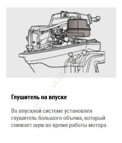 Во впускной системе установлен глушитель большого объема, который снижает шум во время работы мотора.