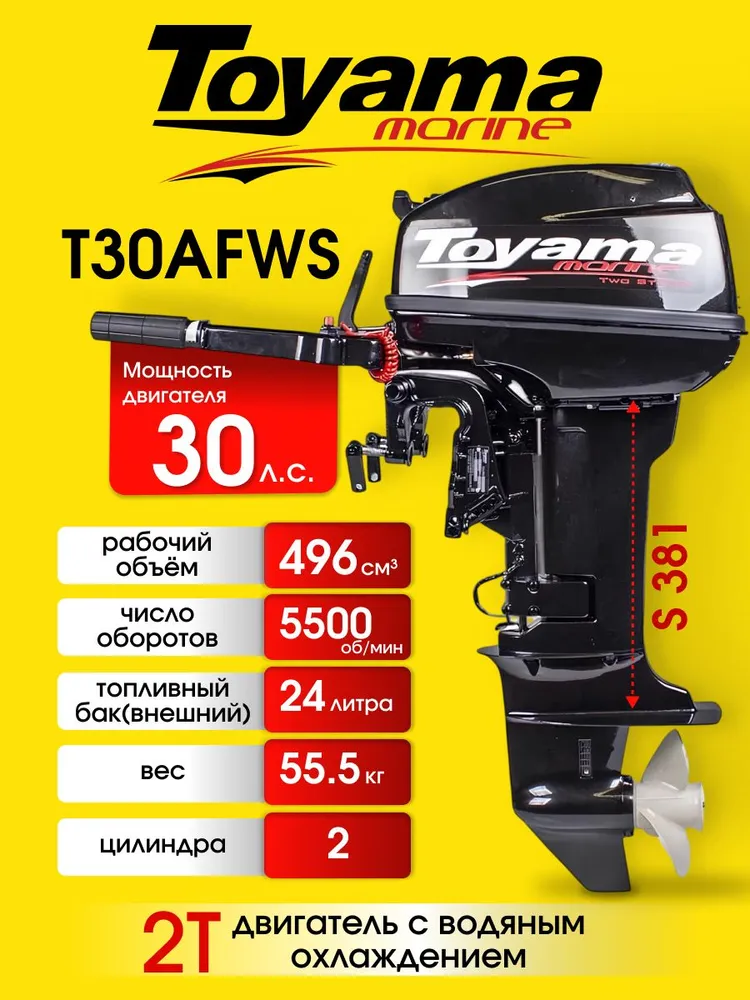 Подвесной мотор TOYAMA T30AFWS развивает мощность 30 л.с. при объеме 496 см3.