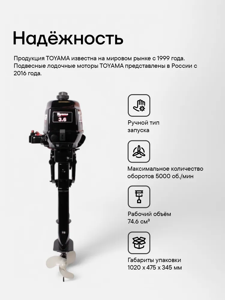 Подвесной лодочный мотор TOYAMA TC3.6BMS рассчитан под стандартную высоту транца 381 мм и имеет общий вес 13.5 кг.