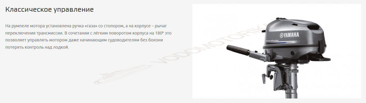 Четырехтактный лодочный мотор Yamaha F 5 AMHS имеет румпельное управление (ручка газа на румпеле).