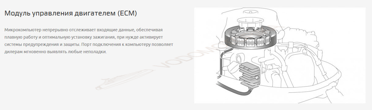 Охлаждается мотор водой, предусмотрено контрольное отверстие для проверки работоспособности системы.