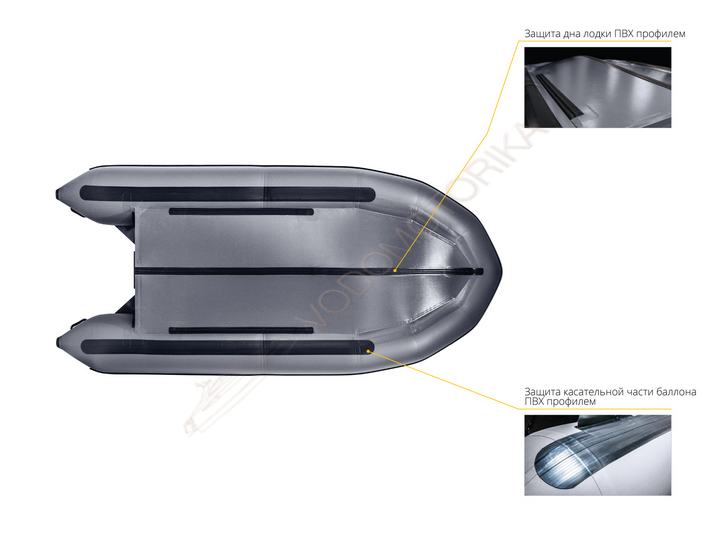Диаметр баллонов надувной лодки 480 мм, 3 отсека (+ киль), швы прошитые и клееные внахлест с накладкой.