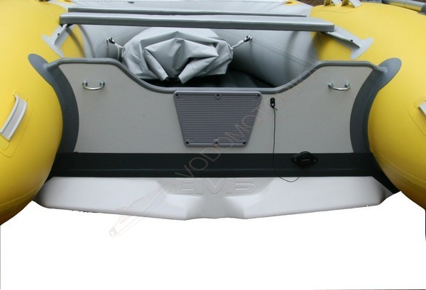 Он расположен под транцем и является жёстким окончанием надувного дна.