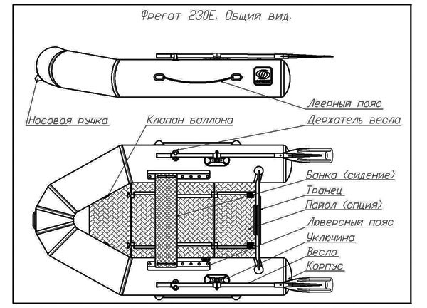 Баллоны Фрегат 230 Е изготовлены из армированного пятислойного ПВХ материала производства немецкой фирмы Mehler Tehnologies, плотность 750 г/м2.