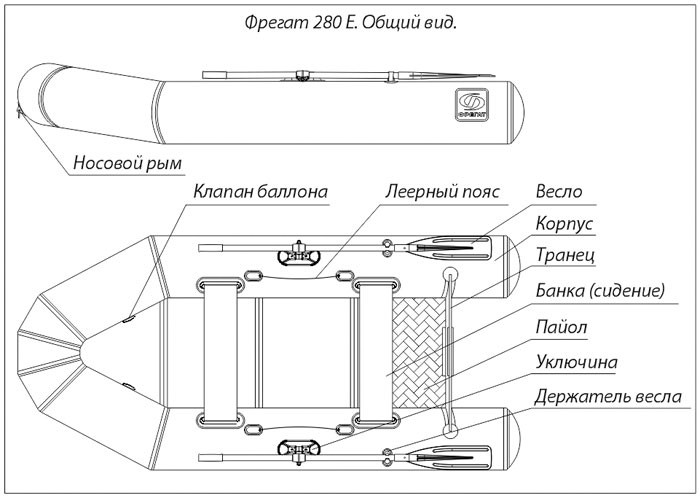 Безопасность пассажиров Фрегат 280 Е дополнительно обеспечивается натянутым вдоль борта леерным тросом. Переноска осуществляется с помощью носовой рым-ручки и специальных вырезов в транце.