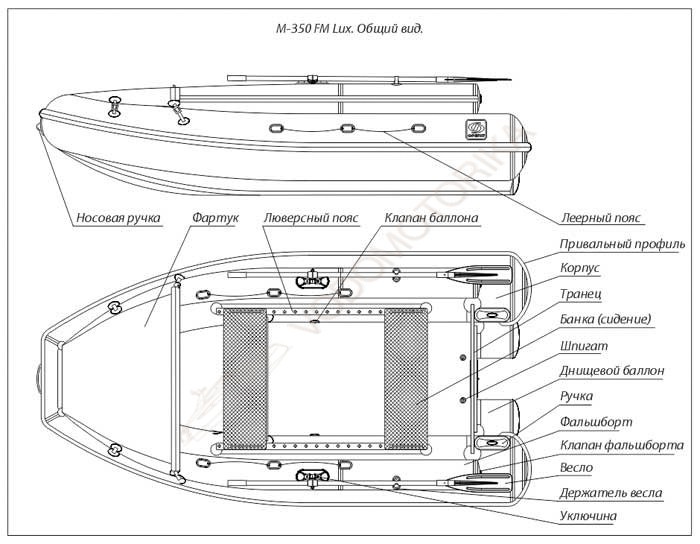 Фрегат М-350 FM Lux имеет надувное днище высокого давления, состоящее из трех отдельных баллонов, которые соединены между собой. Поверх них находится натяжная палуба, которая располагается выше уровня воды, благодаря чему она самостоятельно осушается.