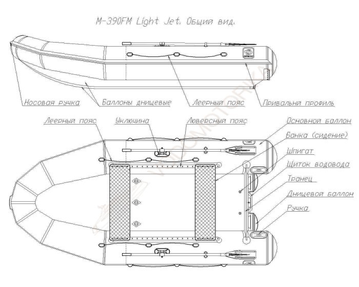 Фрегат М-390 FM Light Jet надувное днище высокого давления, состоящее из трех отдельных баллонов, которые соединены между собой.