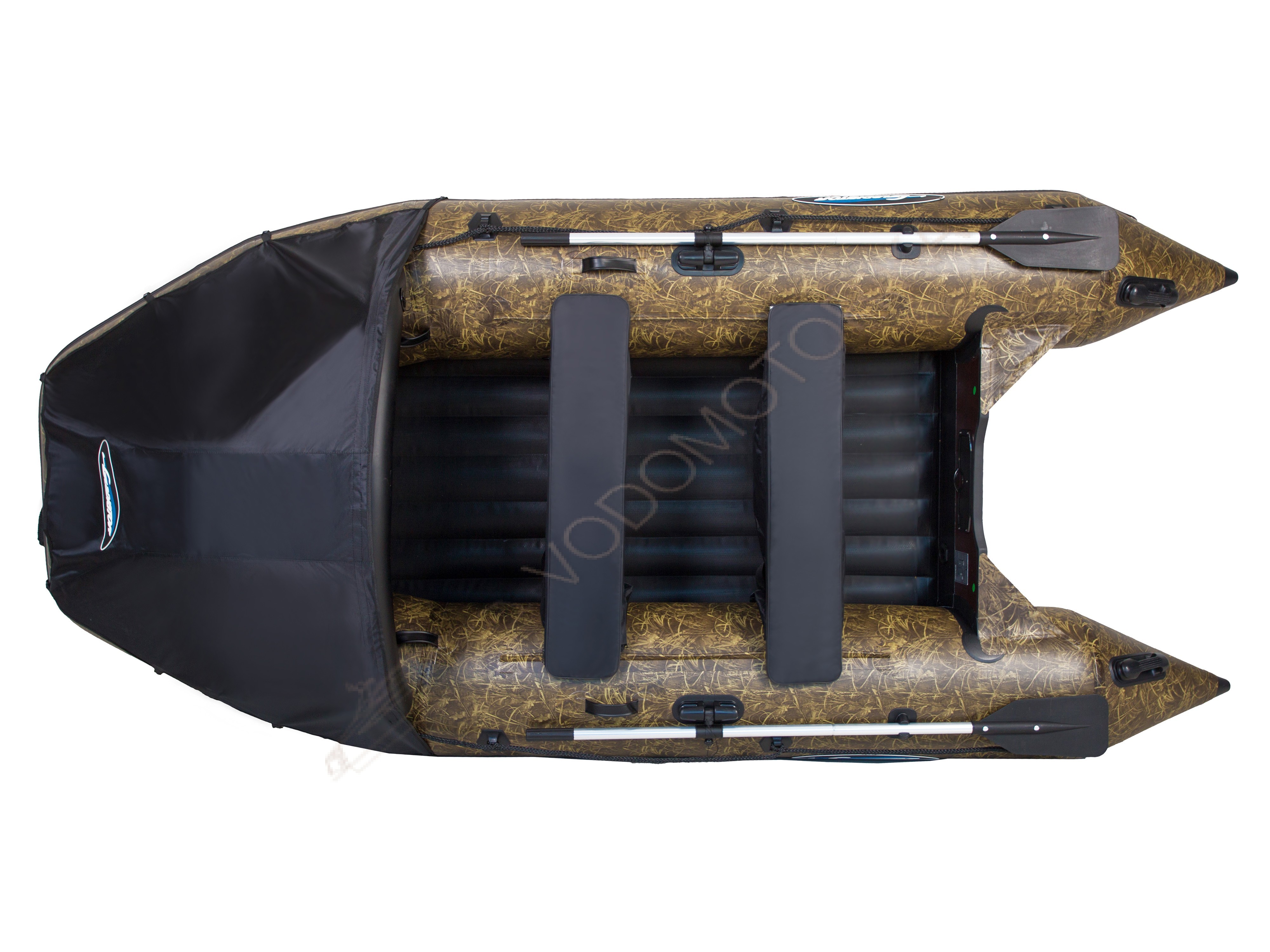 Лодка поставляется в камуфлированной расцветке, представляющей собой отдельный слой ПВХ, что повышает стойкость к истиранию.