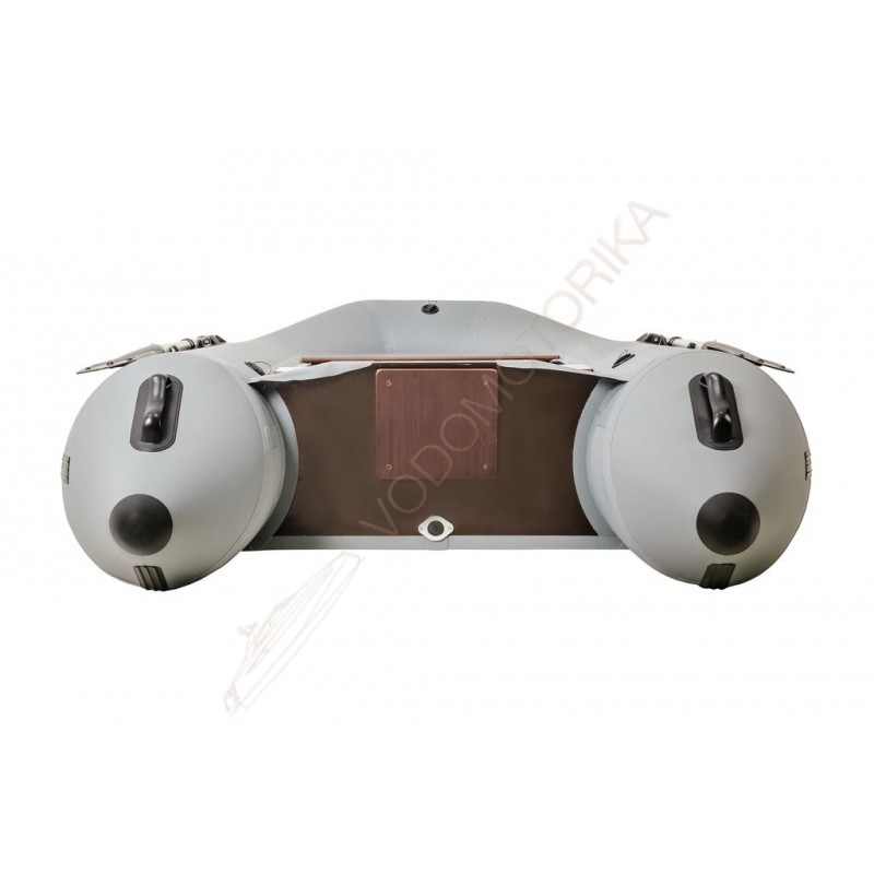 На лодке установлен стационарный транец, жестко приклеенный к баллонам.