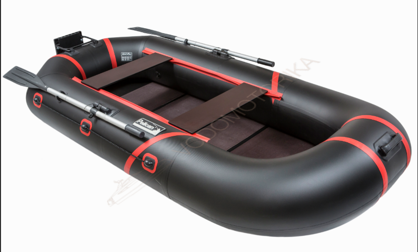 Надувная лодка поставляется в черном цвете с красными вставками.