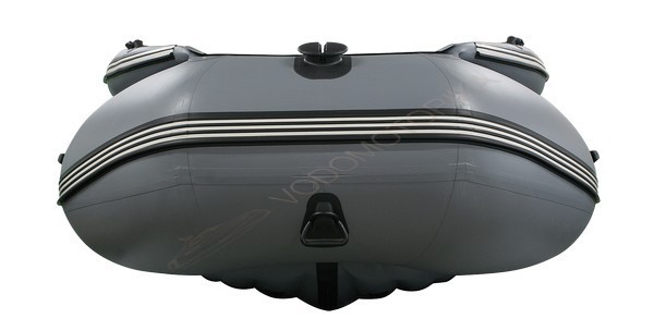 Надувная лодка имеет стационарный транец, жестко приклеенный к баллонам. Транец имеет килевую форму.