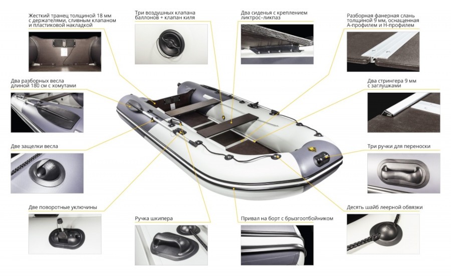 Диаметр баллонов лодки 42 см, 3 герметичных отсека (+ 1 киль).