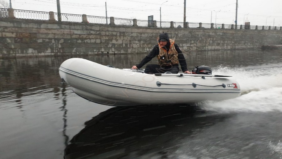 Баллоны переменного сечения лодки X-River ROCKY 395 НДВД изготовлены из армированного пятислойного ПВХ плотностью 900 г/м2, днища 1200 г/м2.