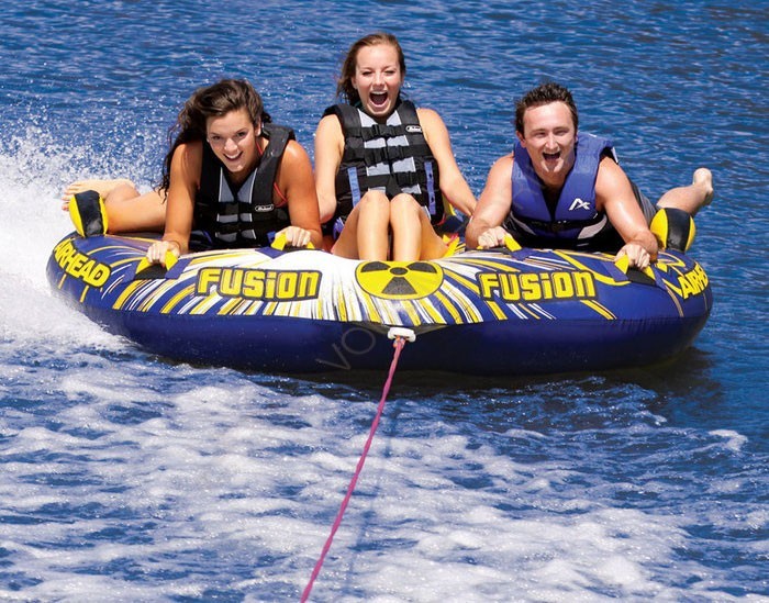 Трехместный надувной аттракцион, оборудованный защитными неопреновыми вставками, подголовником и нейлоновым чехлом из материала с плотностью 840 denier. Для ребенка, находящегося рядом со взрослыми, предусмотрен специальный туннель в центре аттракциона.