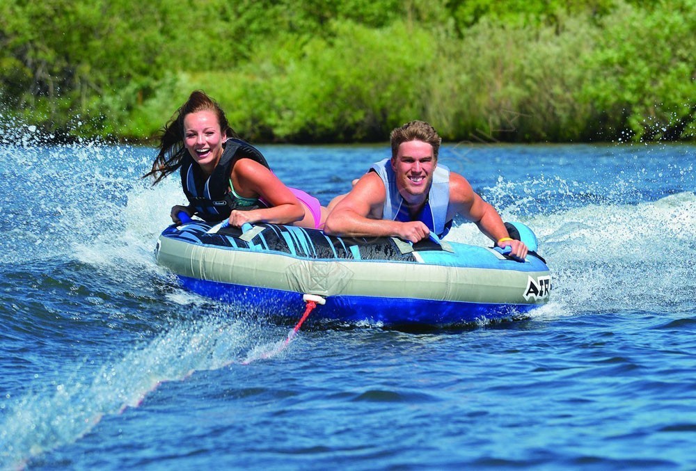 Этот 2-местный надувной аттракцион оборудован четырьмя прочными ручками, боковыми надувными фиксаторами для ног, защитными неопреновыми вставками, и нейлоновым чехлом из материала с плотностью 840 denier.