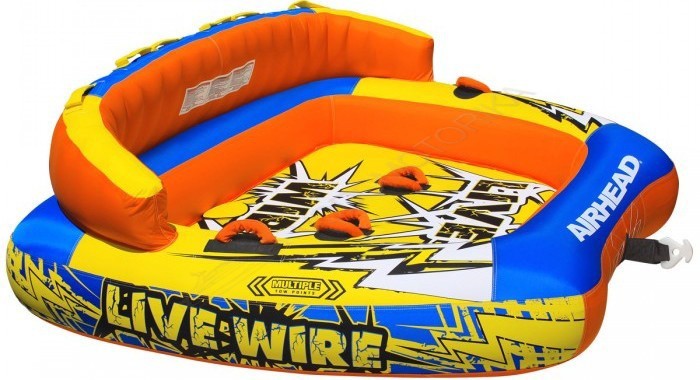 Аттракцион позволяют получить больше впечатлений благодаря двум точкам креления фала: одно крепление в носовой части, другое - в корме. LIVE WIRE можно буксировать в варианте с "диванной" посадкой и в варианте с посадкой "на коленях". Аттракцион полностью покрыт чехлом из нейлона 850 den, оборудован удобными ручками и накладками из неопрена.