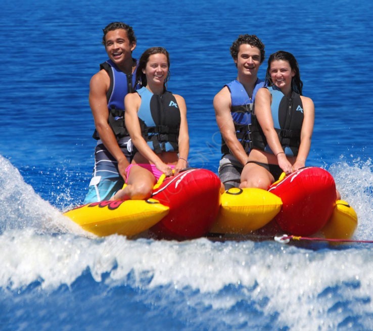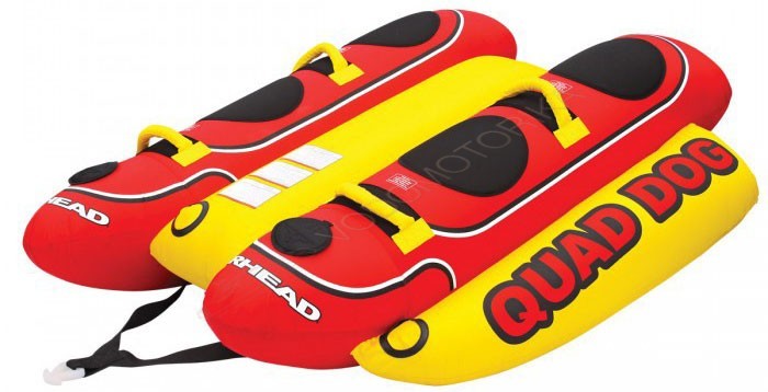 Классическая HOT DOG серия стала лучше! Теперь Вы можете наслаждаться большей устойчивостью на этом водяном банане, разработанном для 4 наездников. У QUAD DOG есть 4 прочные ручки с мягким покрытием. Вздернутые носовые баллоны прорезают воду и предотвращают погружение банана. Пять виниловых воздушных камер полностью заключены в двойной нейлоновый чехол плотностью 840 denier и снабжены нашими запатентованными клапанами для накачивания и удобного выкачивания воздуха.