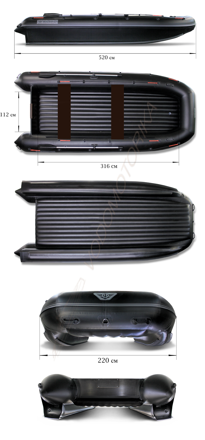 Диаметр основных баллонов 54 см, 4 герметичных отсека (+ 1 дно, + 2 скега).