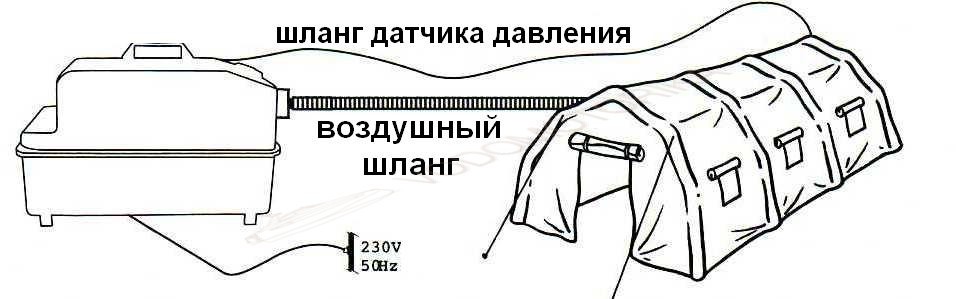 Автоматический насос с питанием от сети 230 В для поддержки давления в надувных сооружениях в заданных пределах. Корпус выполнен в пылеводозащищённом исполнении, класс защиты IP65.