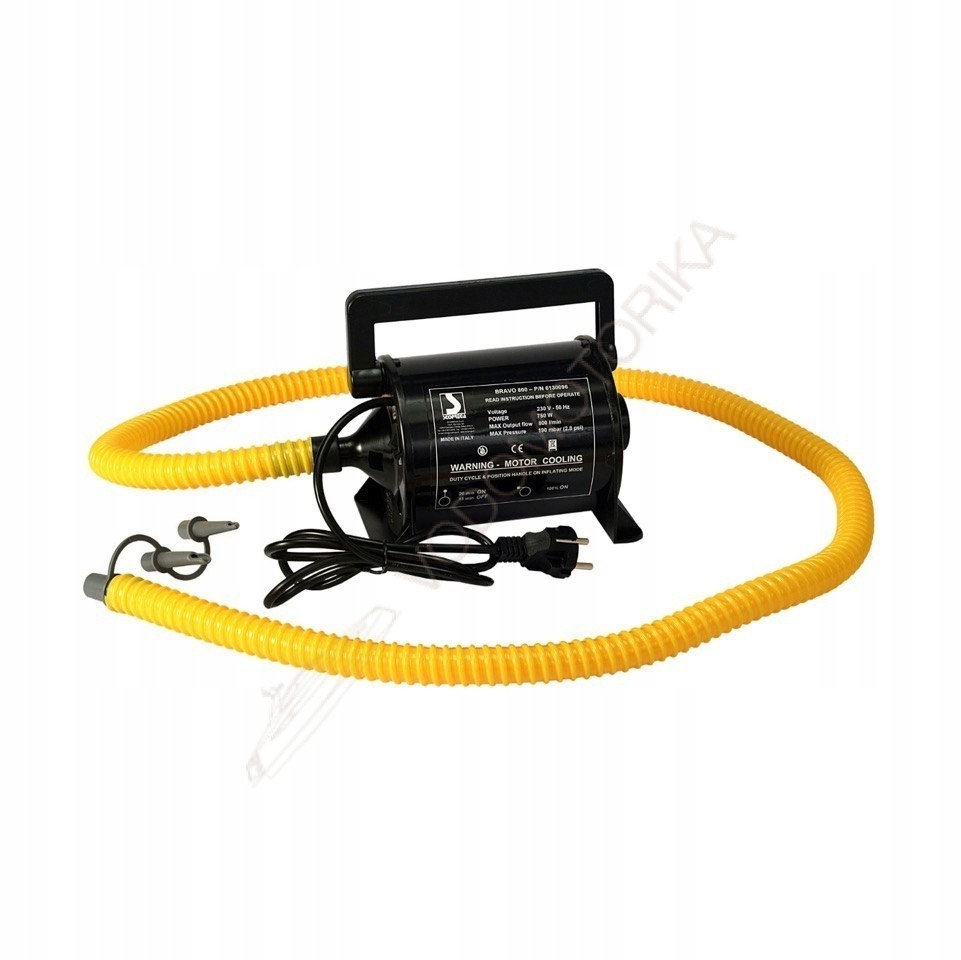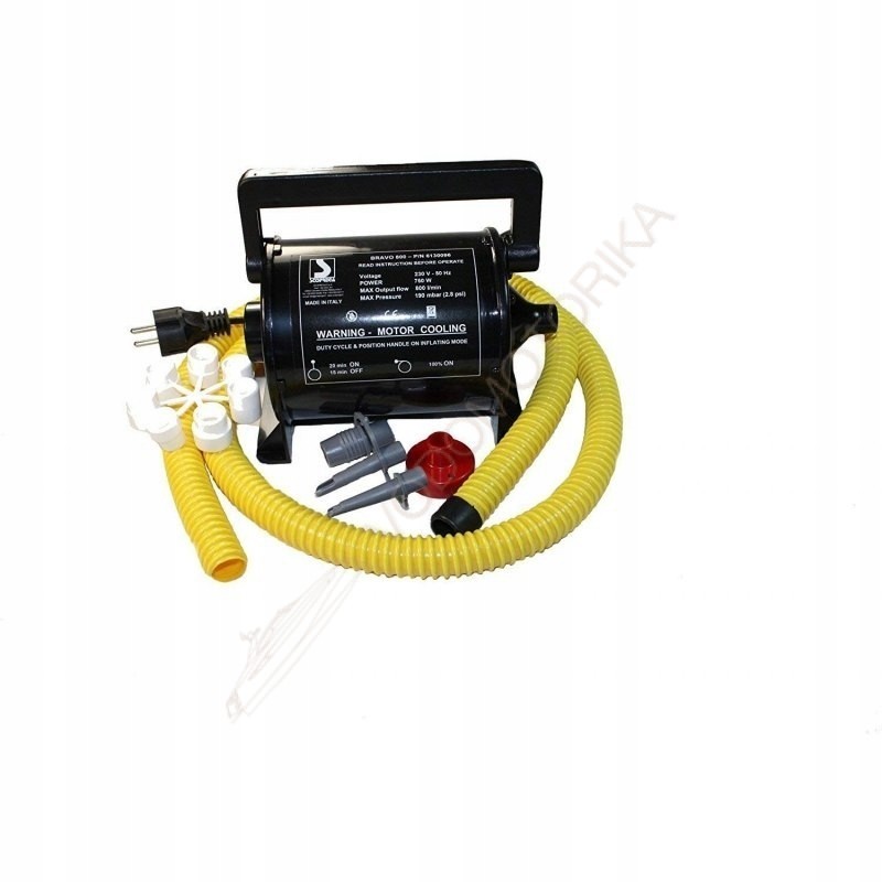 Электронасос с питанием 220V для работы с надувными аттракционами и матрасами. Имеет режим 50% нагрузки для периодического охлаждения мотора. Производительность 800 л/мин., максимальное давление 190 мБар. Комплектуется набором переходников, предназначенных для различных типоразмеров клапанов.