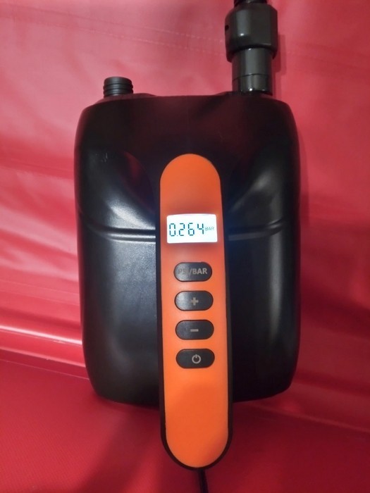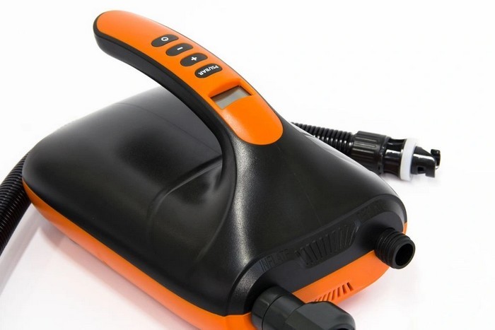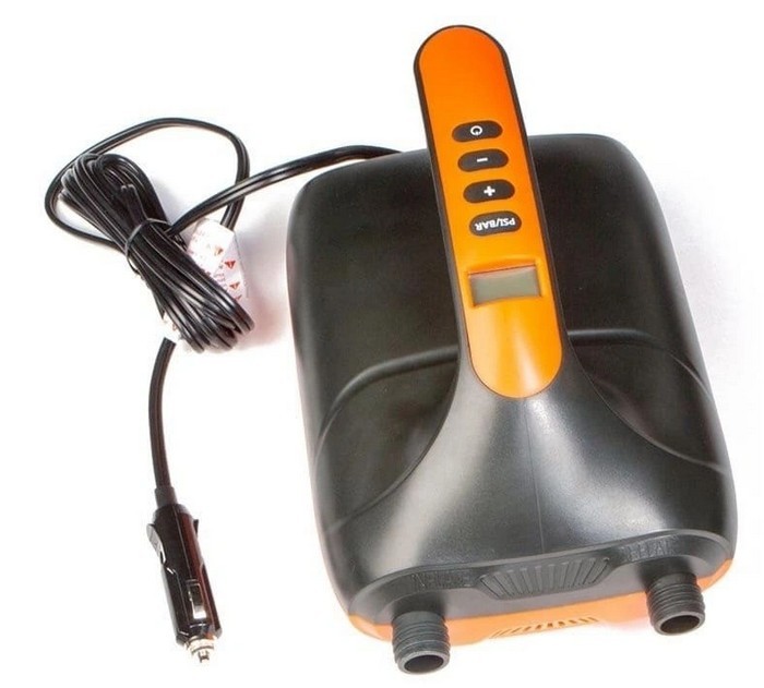 Электрический насос с питанием 12V для лодок и SUP досок, оснащенный разъемом под гнездо прикуривателя. Один из самых мощных двухступенчатых насосов с автоматической регулировкой давления.