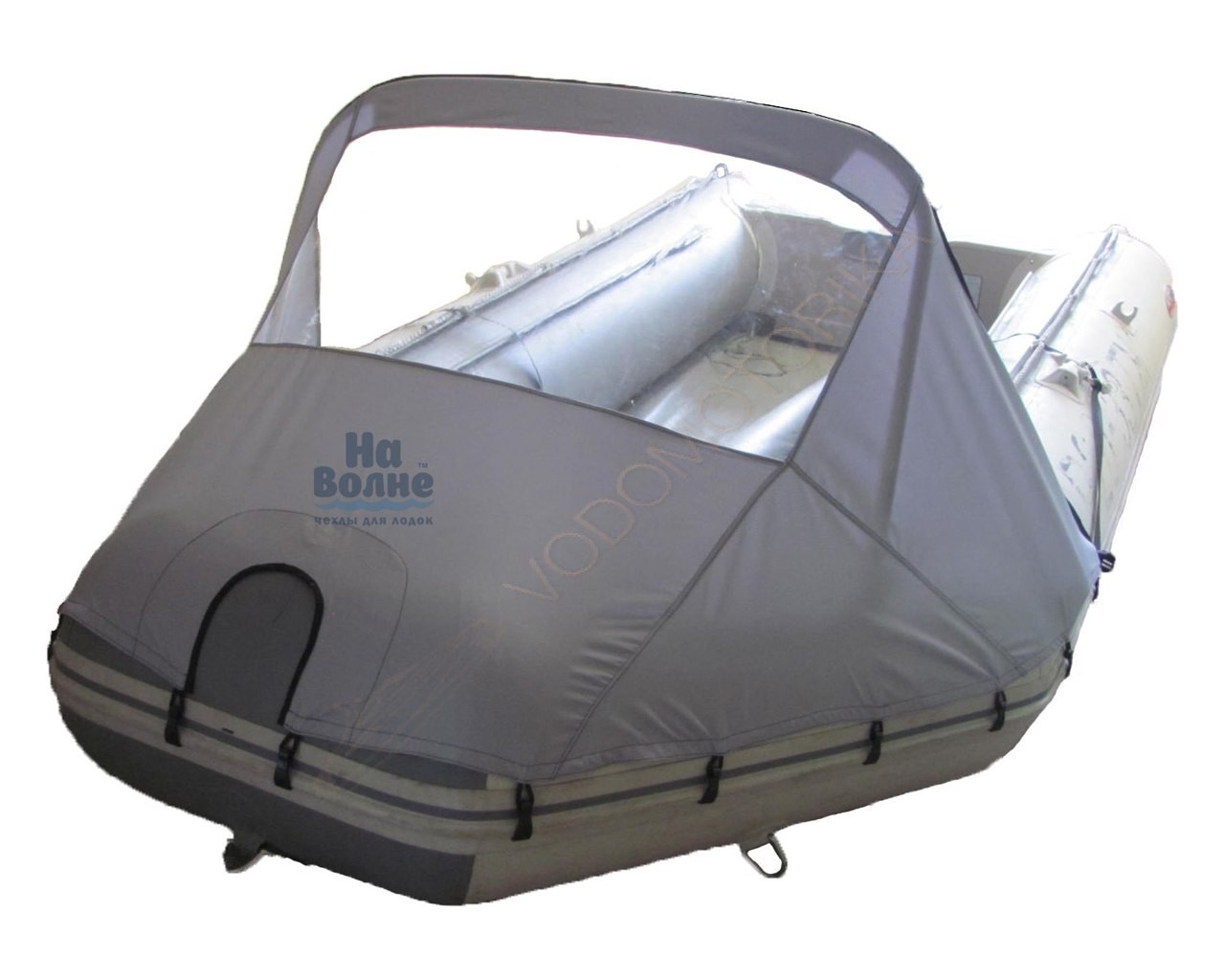 Носовой тент - это надежная конструкция высокого качества. Данный тент защитит Вас от брызг при передвижении на лодке. Тент устанавливается на дюралюминиевый каркас, сами дуги клеятся на баллоны с помощью кронштейнов, а тент крепится за привальный брус с помощью крючков.