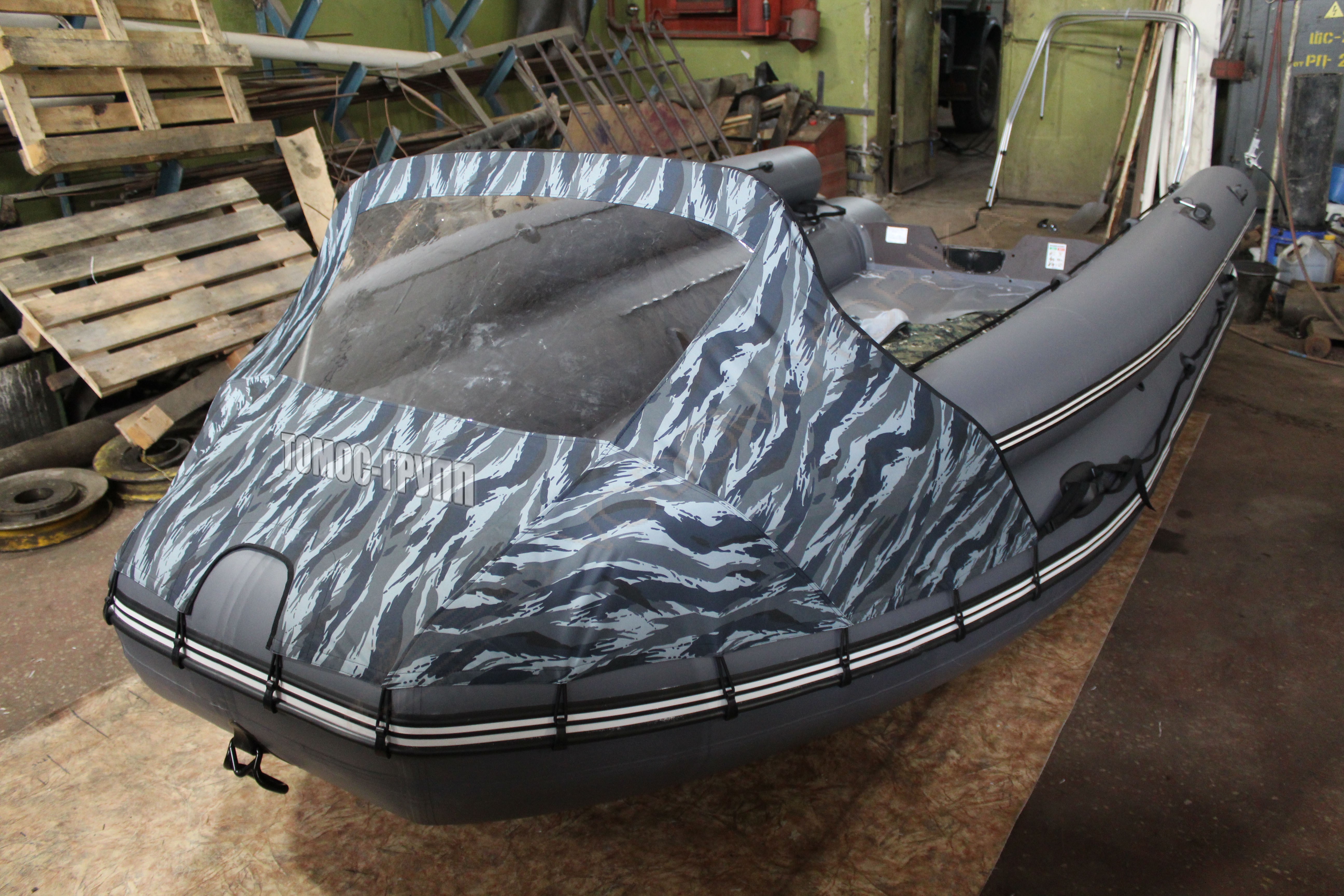 Дуги каркаса крепятся на баллоны лодки с помощью пятаков и клея. После этого на каркас с тентом можно устанавливать на лодку. По нижнему краю тента мы пришиваем специальные крючки, с помощью которых тент крепится за привальный брус на баллонах лодки. Такой способ крепления – самый надежный и легкий, позволяет обойтись без затекания воды под носовой тент во время движения и гарантирует устойчивое положение тента даже во время быстрого движения вперед или назад.