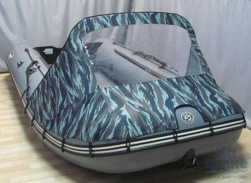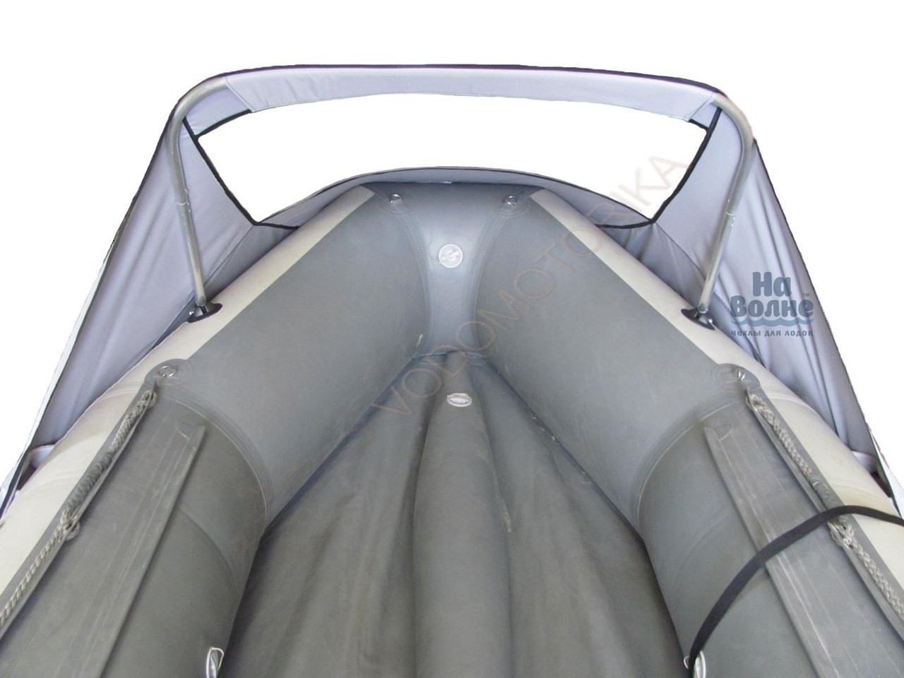 Носовой тент - это надежная конструкция высокого качества. Данный тент защитит Вас от брызг при передвижении на лодке. Тент устанавливается на дюралюминиевый каркас, сами дуги клеятся на баллоны с помощью кронштейнов, а тент крепится за привальный брус с помощью крючков.