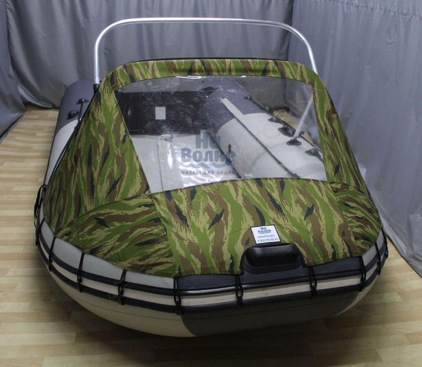 Носовой тент - это надежная конструкция высокого качества. Данный тент защитит Вас от брызг при передвижении на лодке. Тент устанавливается на дюралюминиевый каркас, сами дуги клеятся на баллоны с помощью кронштейнов, а тент крепится за привальный брус с помощью крючков.