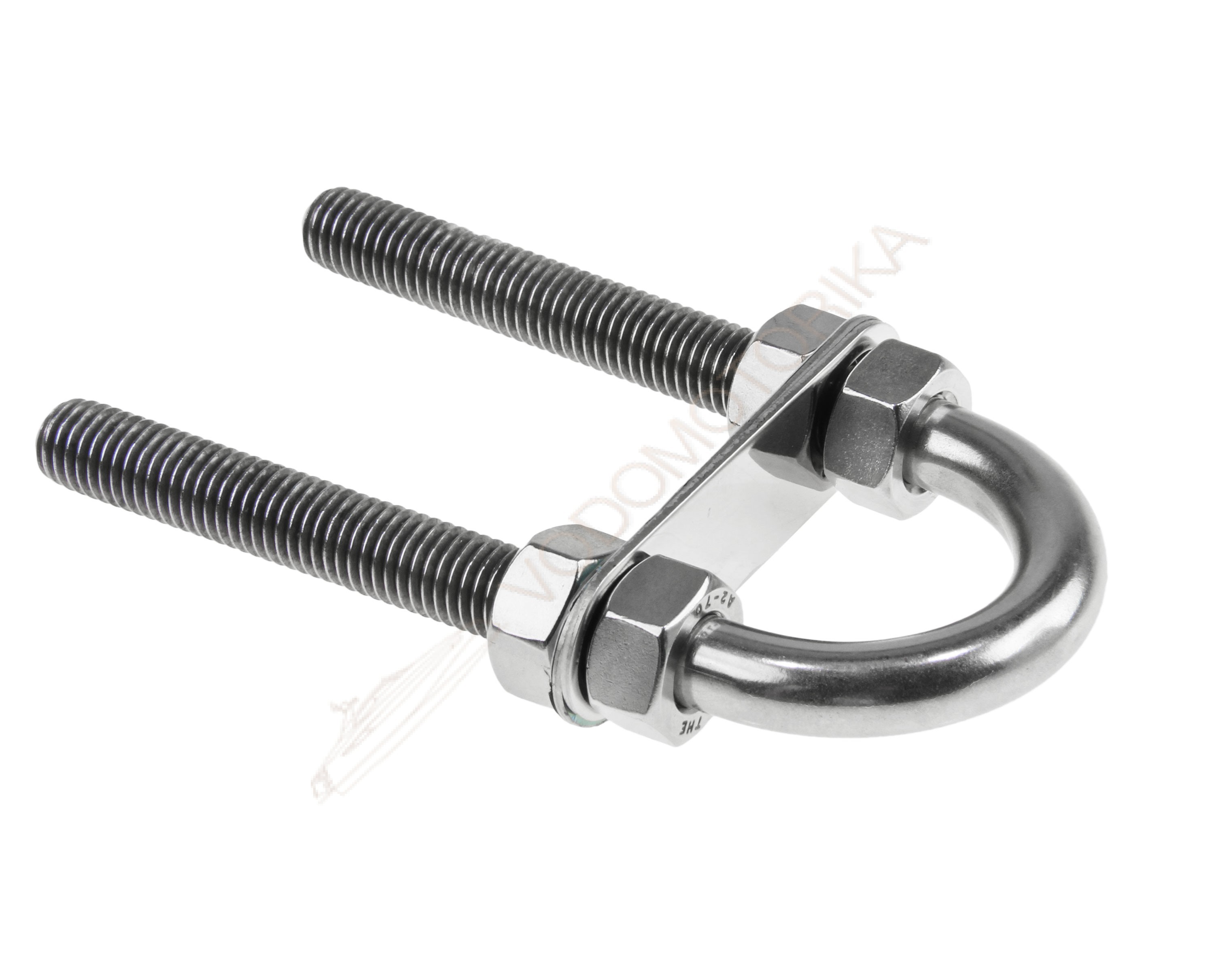 Рым-болт U-образный с крепежными пластинами. Применяется для крепления цепей, тросов, веревок, а также для подъема грузов во время такелажных работ. Выполнен из нержавеющей стали.