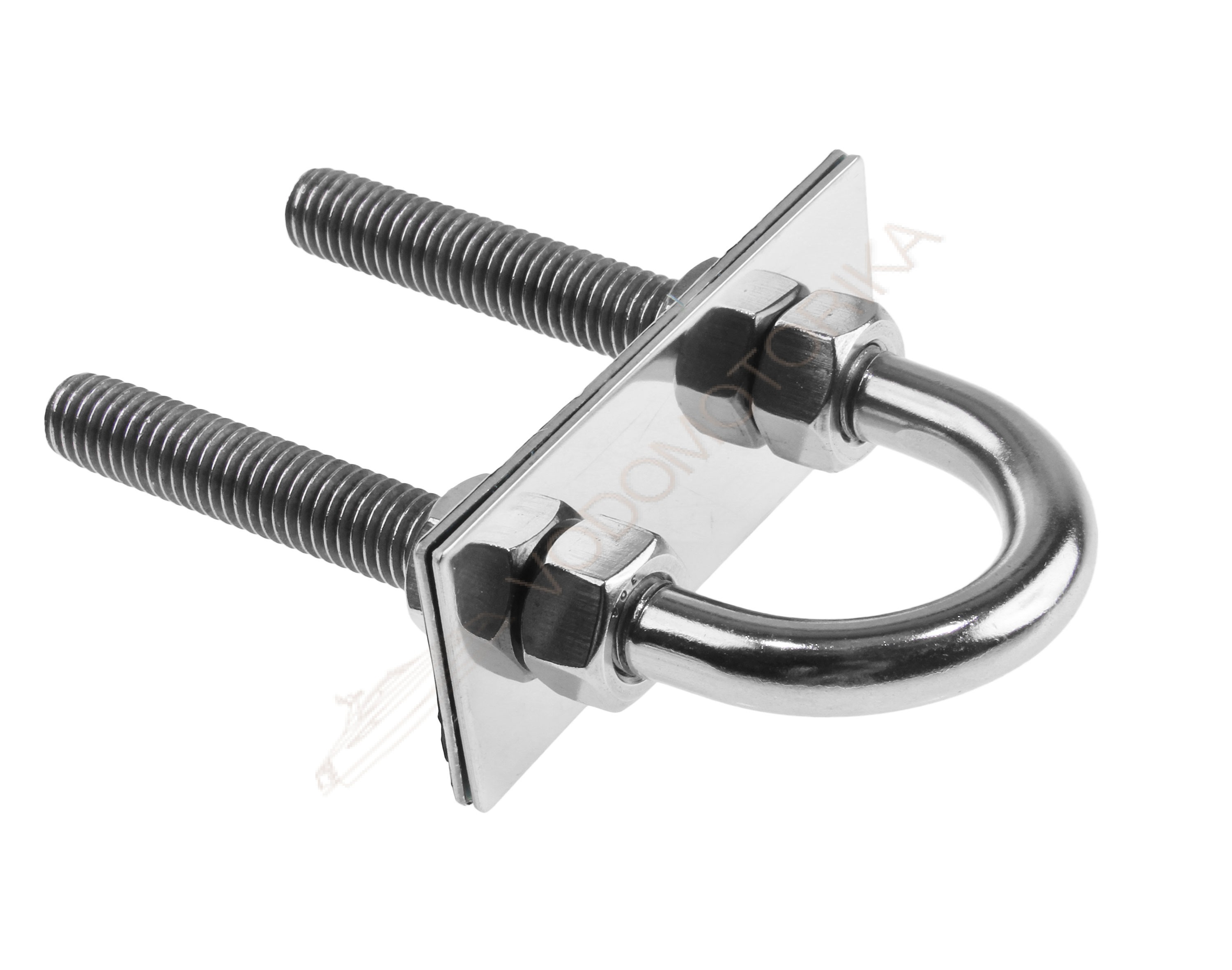 Рым-болт U-образный с крепежными пластинами. Применяется для крепления цепей, тросов, веревок, а также для подъема грузов во время такелажных работ. Выполнен из нержавеющей стали.