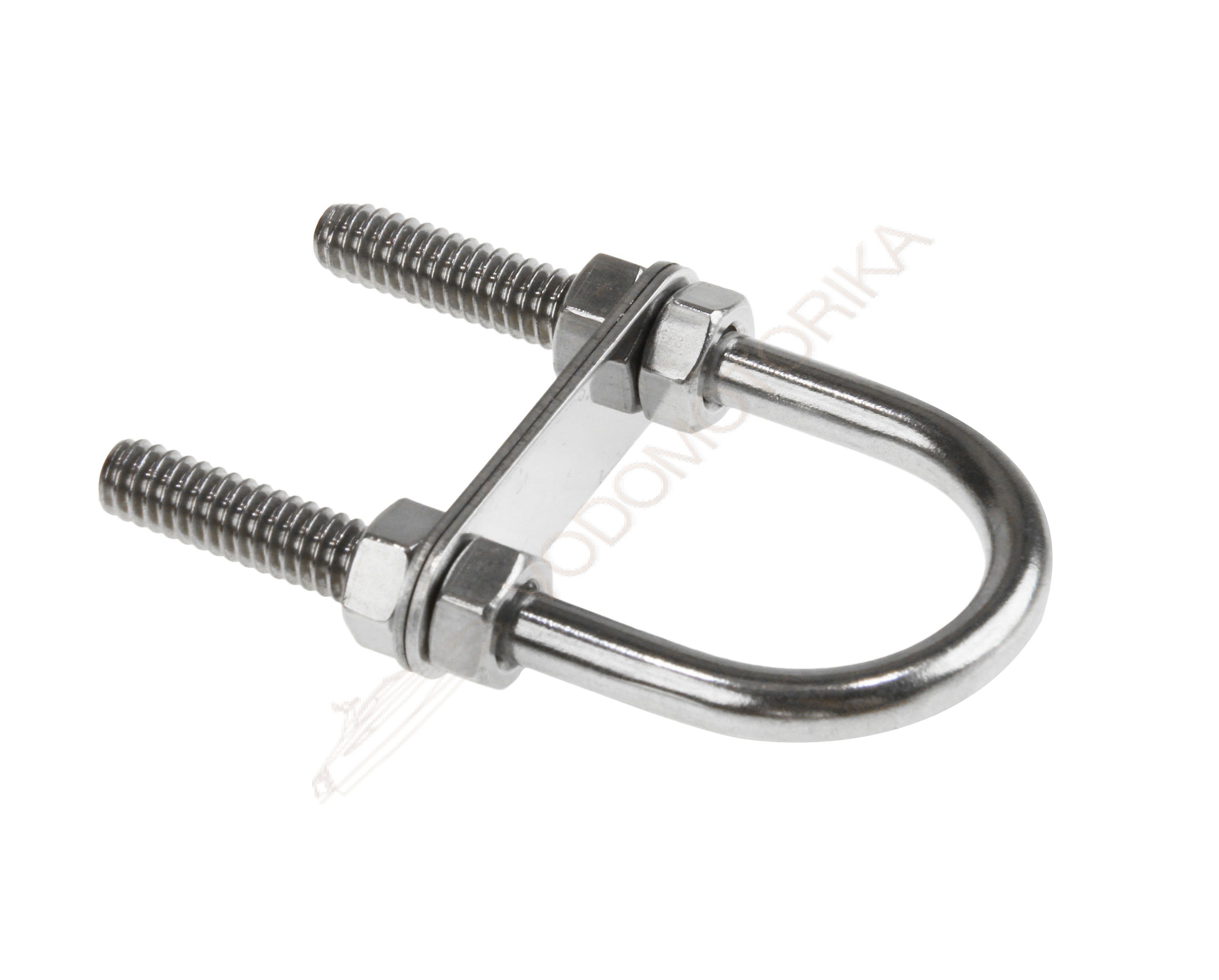 Рым-болт U-образный с крепежными пластинами. Применяется для крепления цепей, тросов, веревок, а также для подъема грузов во время такелажных работ. Выполнен из нержавеющей стали.