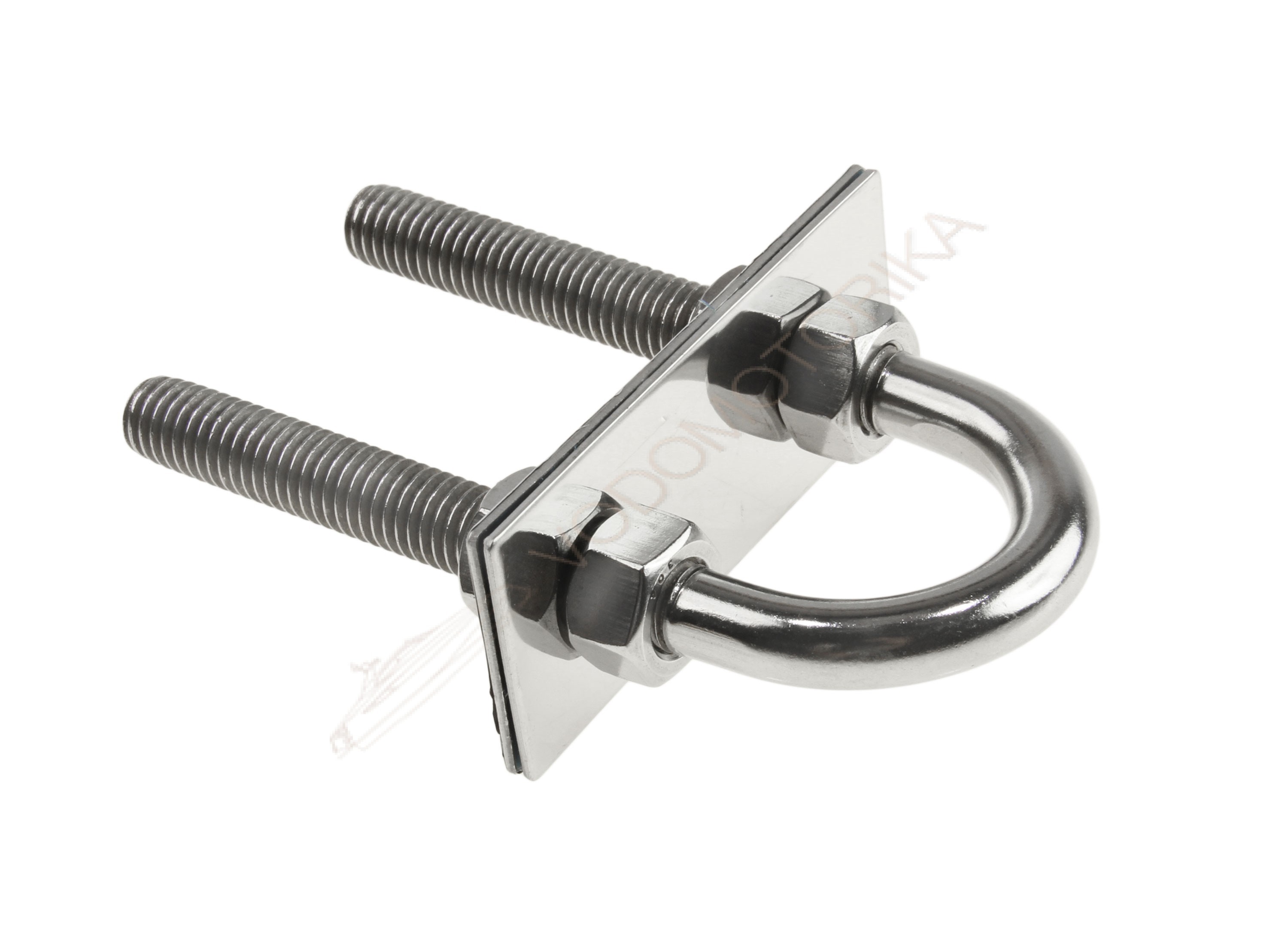 Рым-болт U-образный с крепежными пластинами. Применяется для крепления цепей, тросов, веревок, а также для подъема грузов во время такелажных работ. Выполнен из нержавеющей стали.
